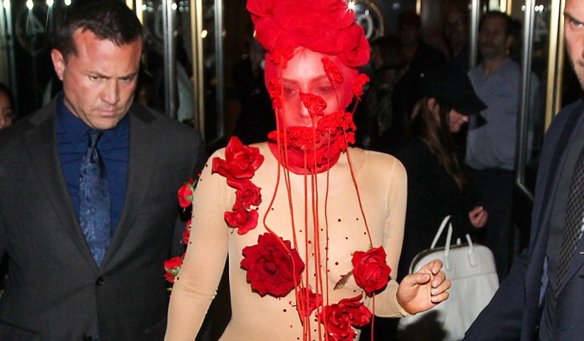 На этот раз эпатажная звезда Lady GaGa вышла “в свет” в прозрачном в полупрозрачной комбидрессе, сквозь которые видно нижнее белье. Бюстгальтера у певицы не оказалось, зато по всему телу “разбросаны” розы, на голове чудная шапочка, полностью закрывающая лицо и длинная красная фата.